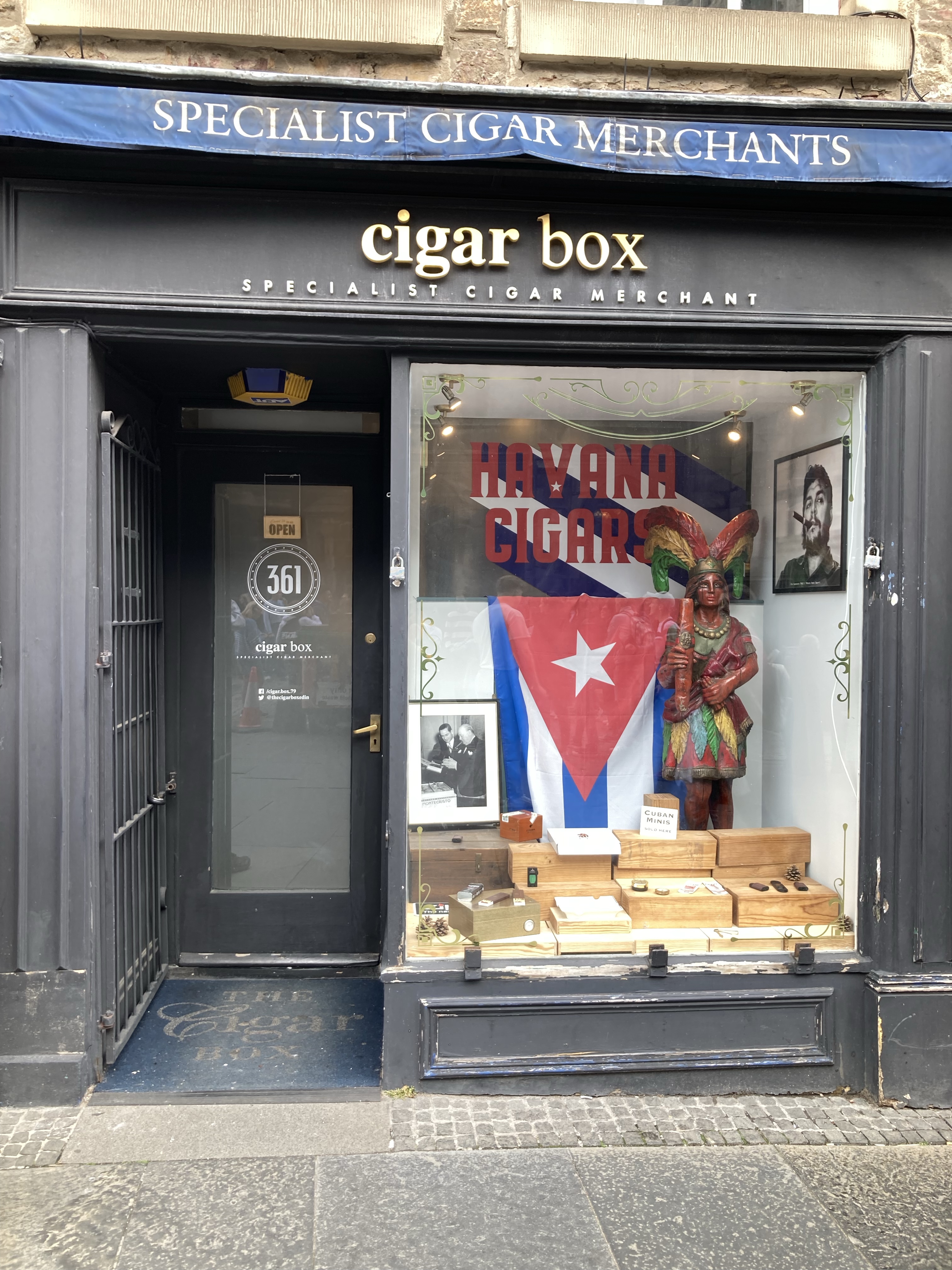 You can find this cigar shop along Edinburgh’s High Street in the Old Town; a short walk away from Edinburgh Castle. This is a bustling area with tourists, but the perfect location if you are visiting the sights. It has a delightful-looking shop front, with its homage to Havana, Cuba and a picture of Che Guevara through the window.