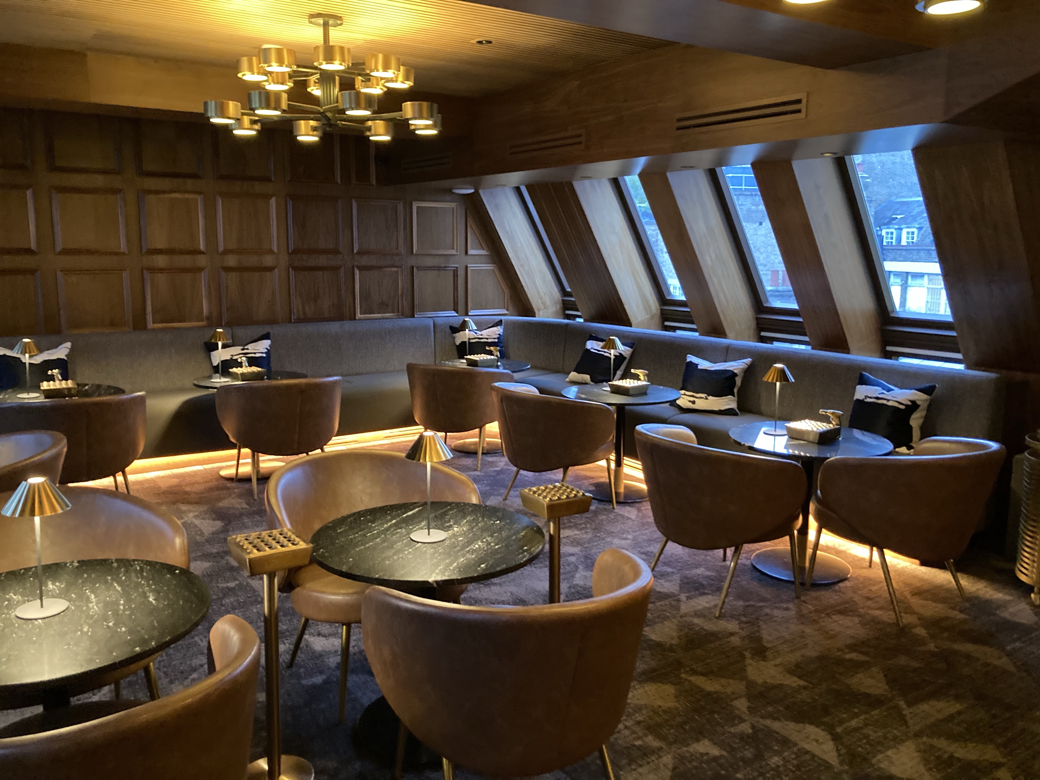 The dark, rich wooden paneling, plush leather chairs (approx 24), and elegant tables (approx 8) created a sophisticated atmosphere. The ambient lighting added a warm glow, further accentuating the elegance of the space. Additionally, the windows provided a neat view over the buildings in London’s Mayfair. Indeed, it is a very special and unique place!