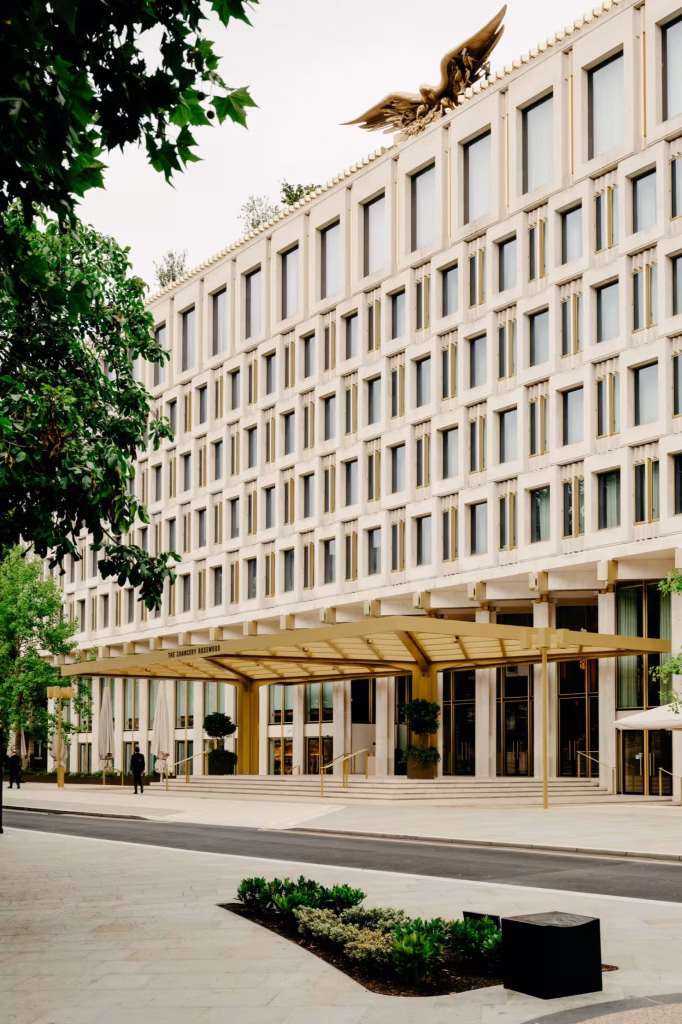 The Chancery Rosewood, which opened in September 2025 following a £1bn restoration, occupies the reimagined embassy building on Grosvenor Square. Redesigned by British architect Sir David Chipperfield, the hotel features 144 suites by French designer Joseph Dirand, alongside a wide range of dining and entertainment spaces.